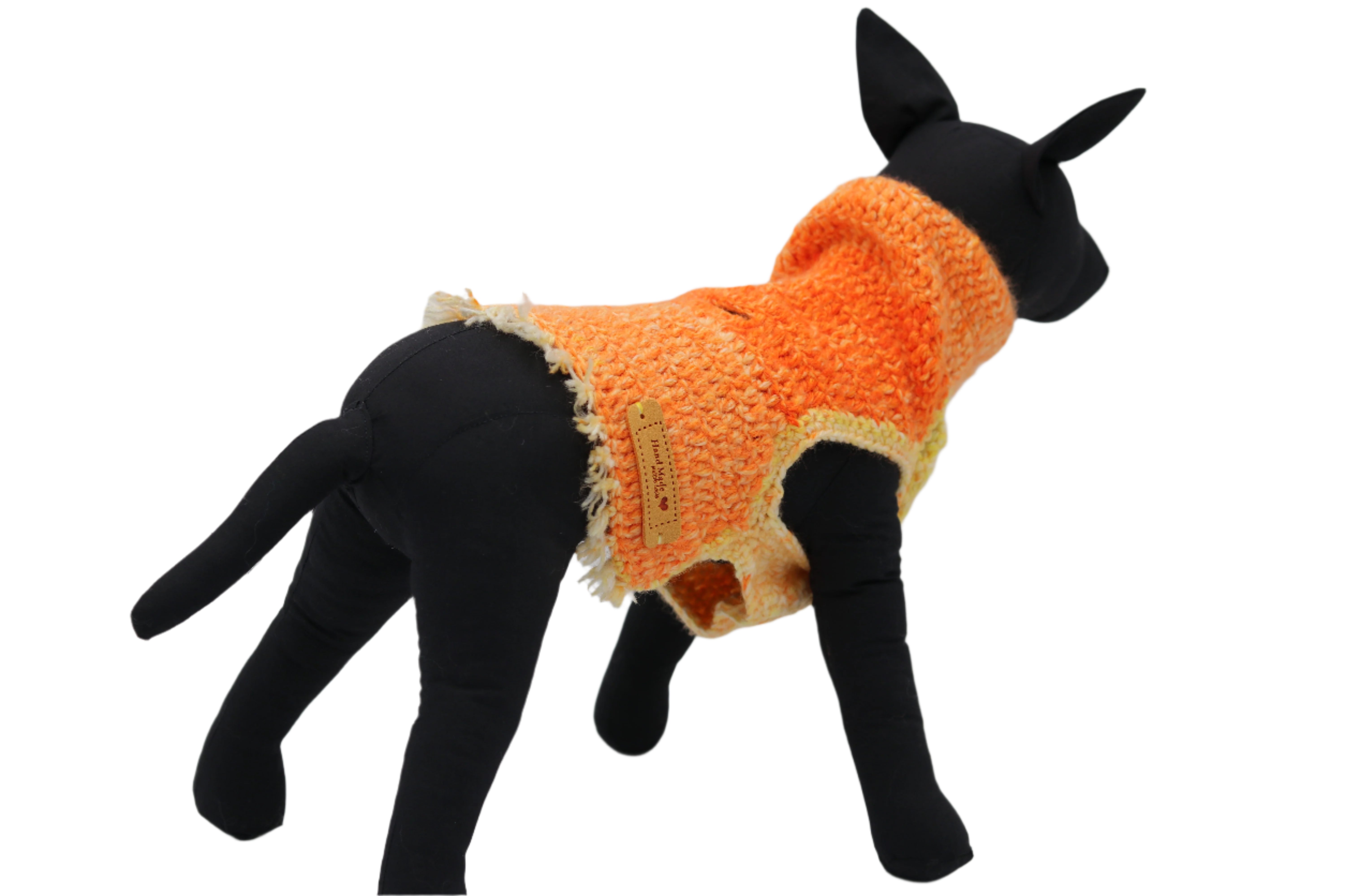 Keep your furry friend cozy and stylish with this handmade crochet vest. Crafted with high-quality yarn in a beautiful gradient of warm tones like orange and yellow, this piece is perfect for adding comfort and charm to your pup’s wardrobe.